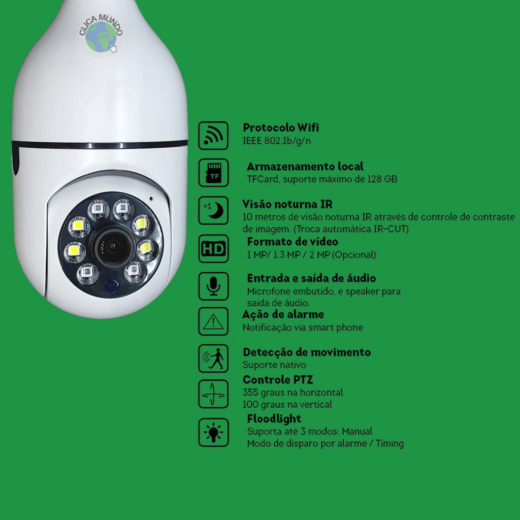 Com a Câmera Lâmpada IP Panorâmica com Rastreio você terá acesso remoto pelo celular de qualquer lugar do mundo. É o equipamento ideal para segurança residencial e comercial.