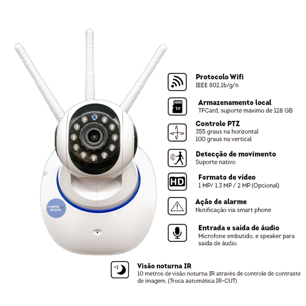 Com a Câmera IP 3 Antenas você terá acesso remoto pelo celular de qualquer lugar do mundo. É o equipamento ideal para segurança residencial e comercial. Fixe sua câmera no teto, parede ou simplesmente deixe-a em cima da estante.